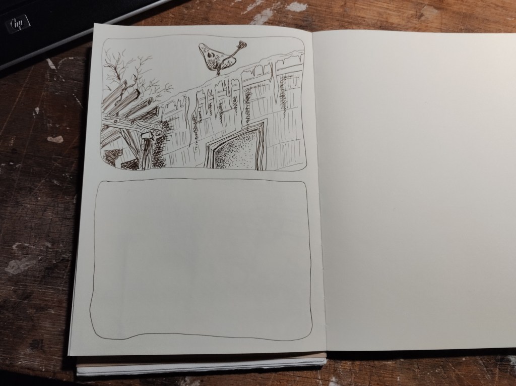 It’s laundry day again, down in the furnace workshop. Everything’s sorted into little heaps and I’m here at the bench drawing the next page of I, Triangle Head while the machines chug away.