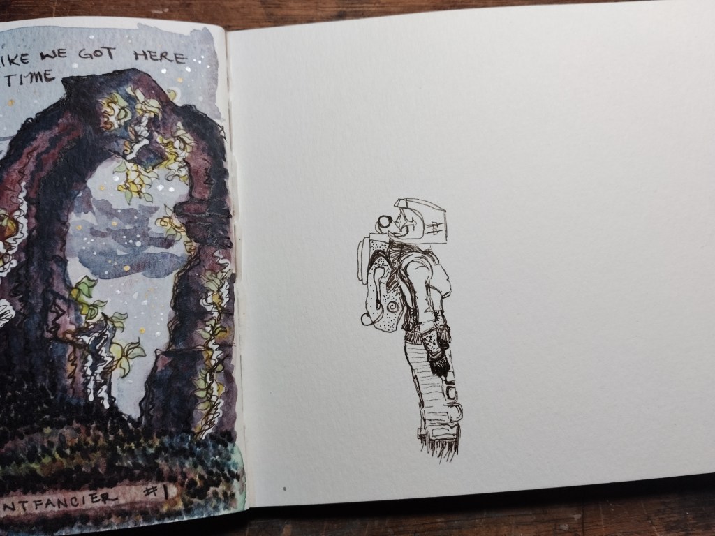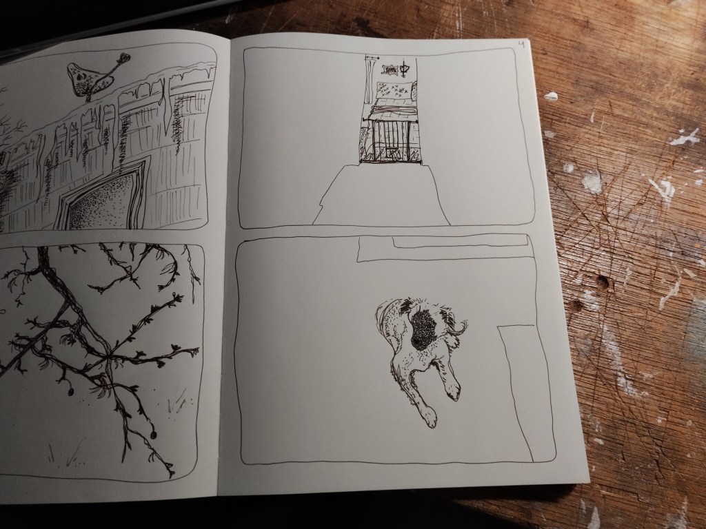 Meanwhile I’m plugging away at the little adventure comic and plugging away at the laundry, down in the basement, snow piling up outside and muting the light trickling in through the glass block windows.