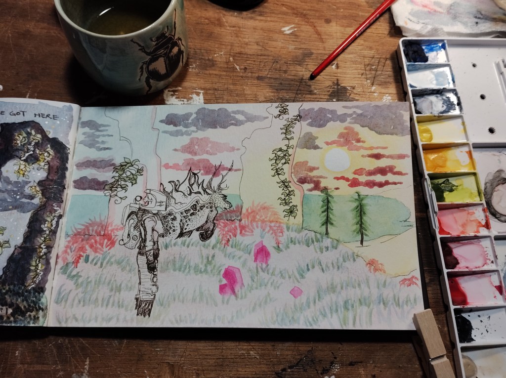 I’m working on layering some detail into the grass this morning, down in the furnace workshop. I’ve got towels going in the laundry room outside the saloon doors, and upstairs I hear the rattle of the puppy’s stuffed worm, a hand-me-down from the cat, and the telltale thump of a jump down from the bed, where she knows she is not allowed.