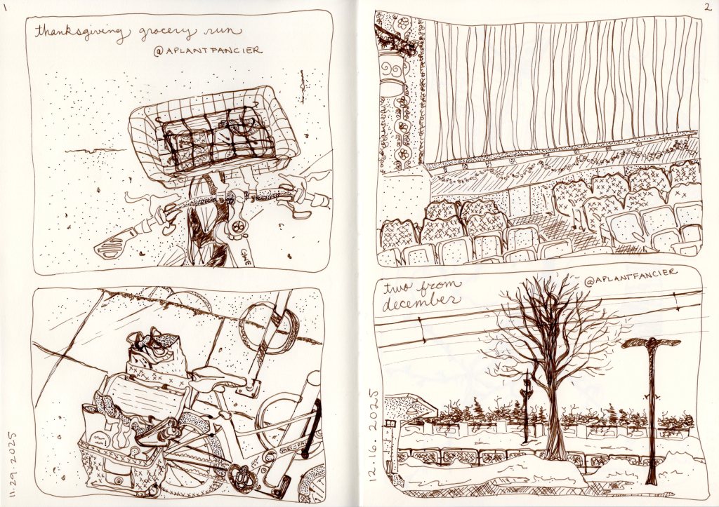 Around this time in 2022, Thanksgiving week if I remember right, I biked over to Blick and got a little Cotman student watercolor palette, and a 6×8 watercolor block, and a couple of brushes — I’d always wanted to learn to paint.