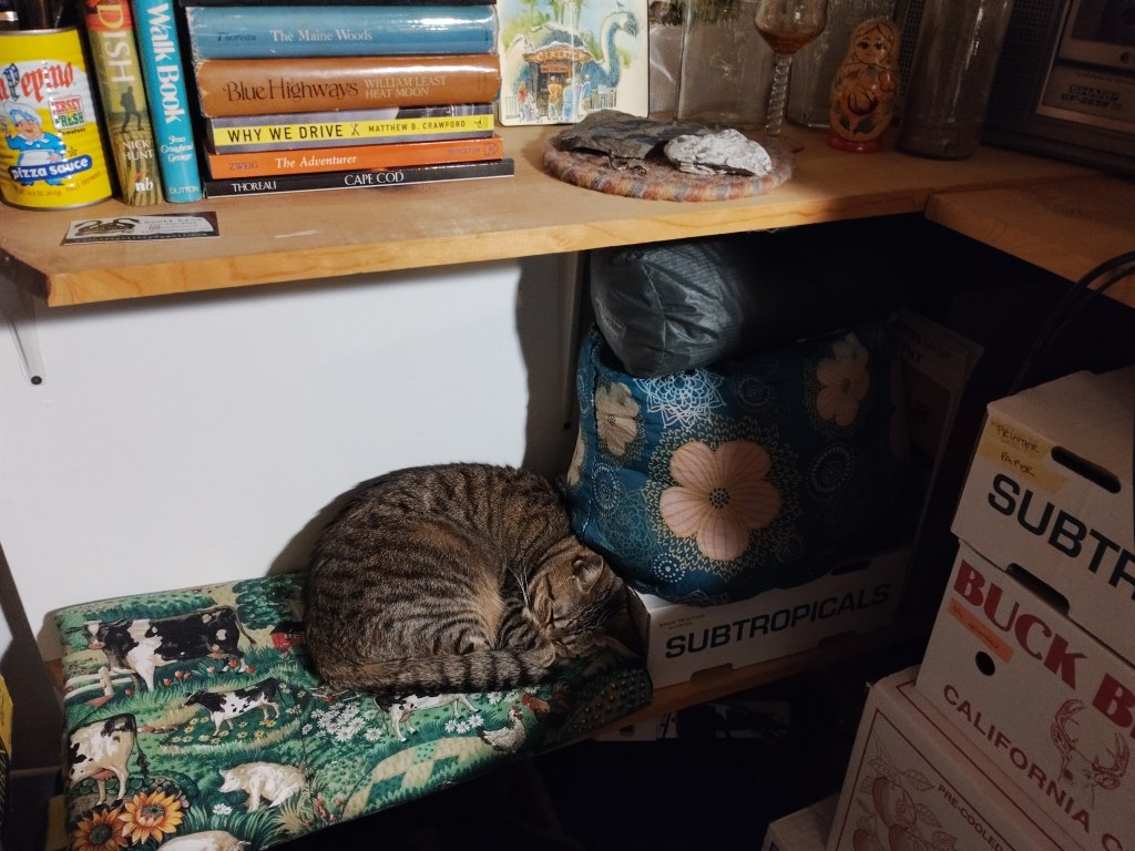By the way, while I didn’t start the blog so much as pay for it and then agonize about it for a year, I did adopt the cat, and she is as perfect a creature as I have ever known. Her interests include riding around on top of a cat backpack but refusing to go inside it, slapping voles in the garden, hissing at rain, and sticking her whiskers up my nose.
