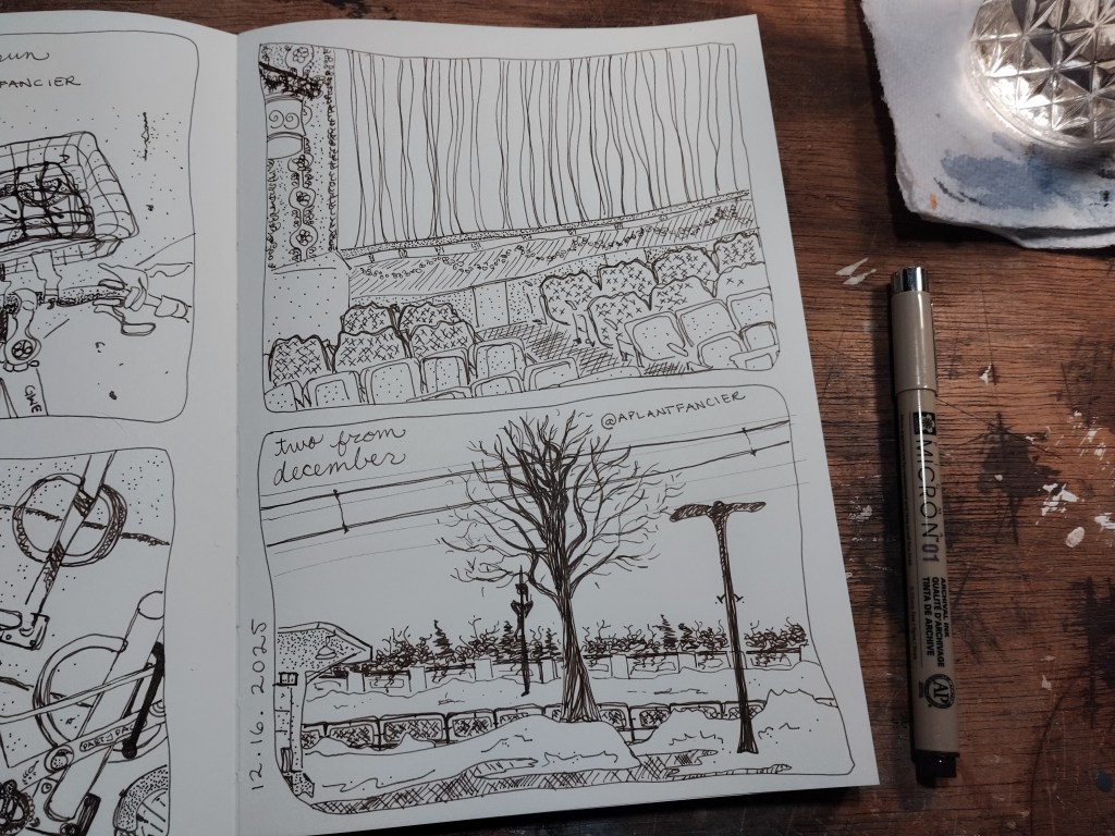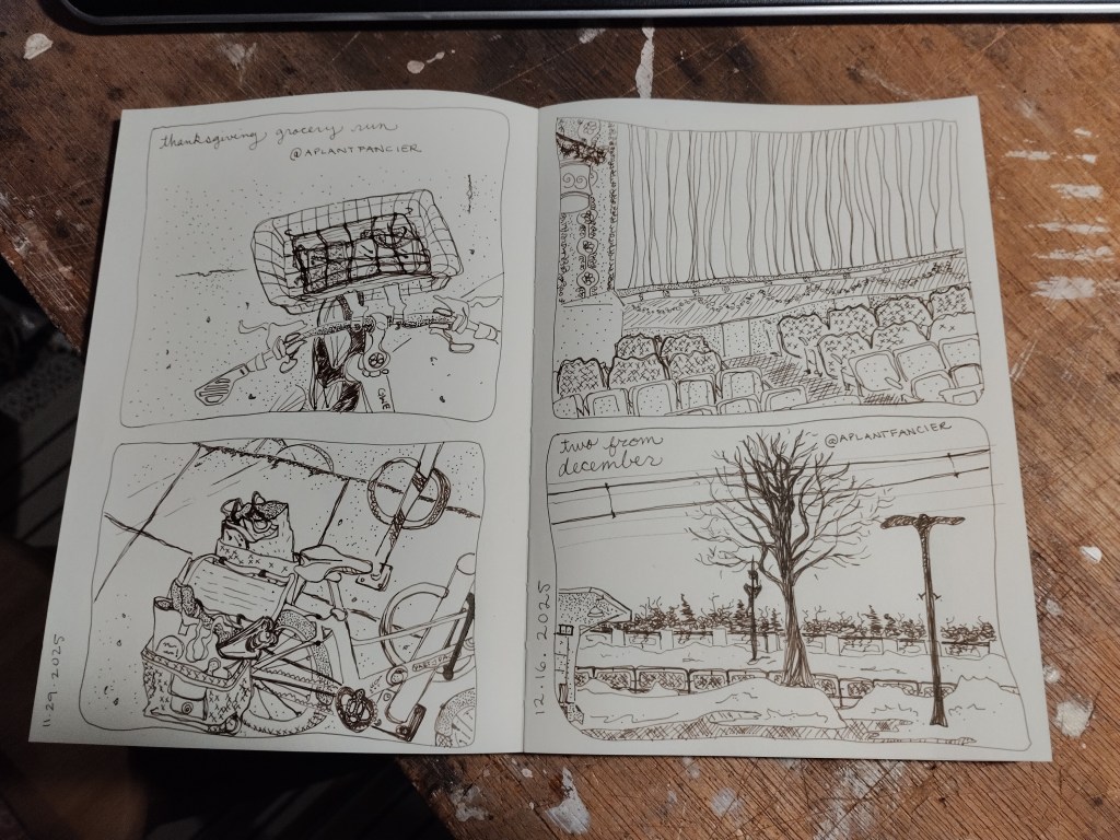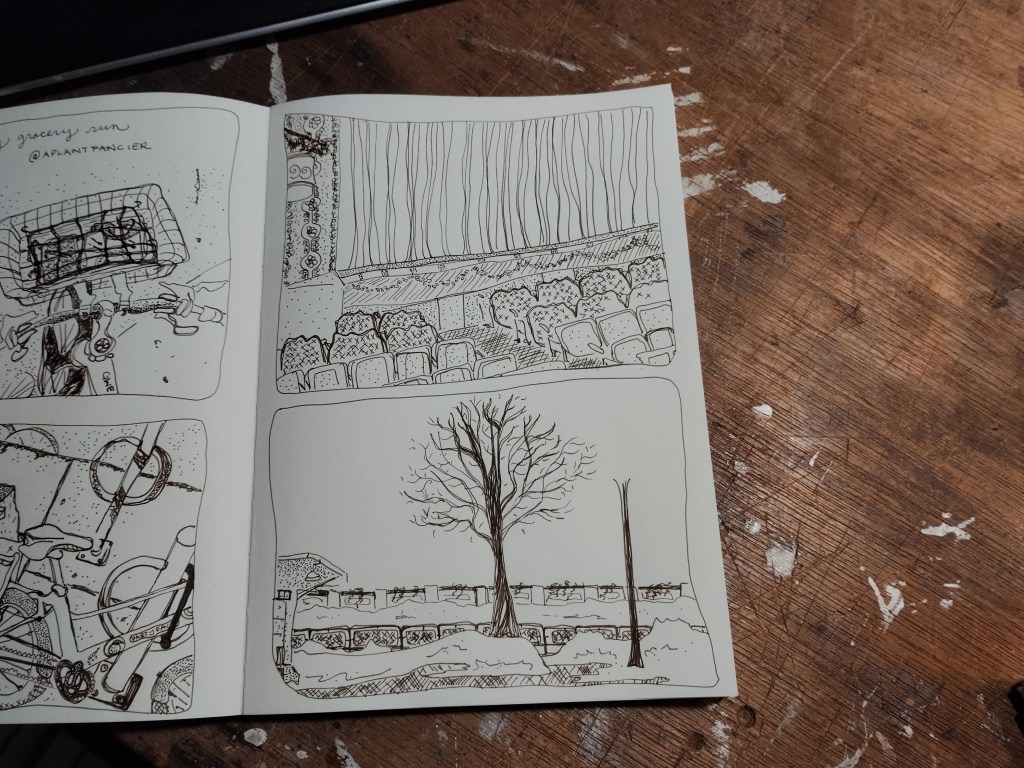 I’m back in the new MIDORI notebook today, noodling around with a sepia #1 SAKURA Pigma Micron while layers of my adventure comic dry. I think it’s going to be good for me, learning to communicate in a different medium.
