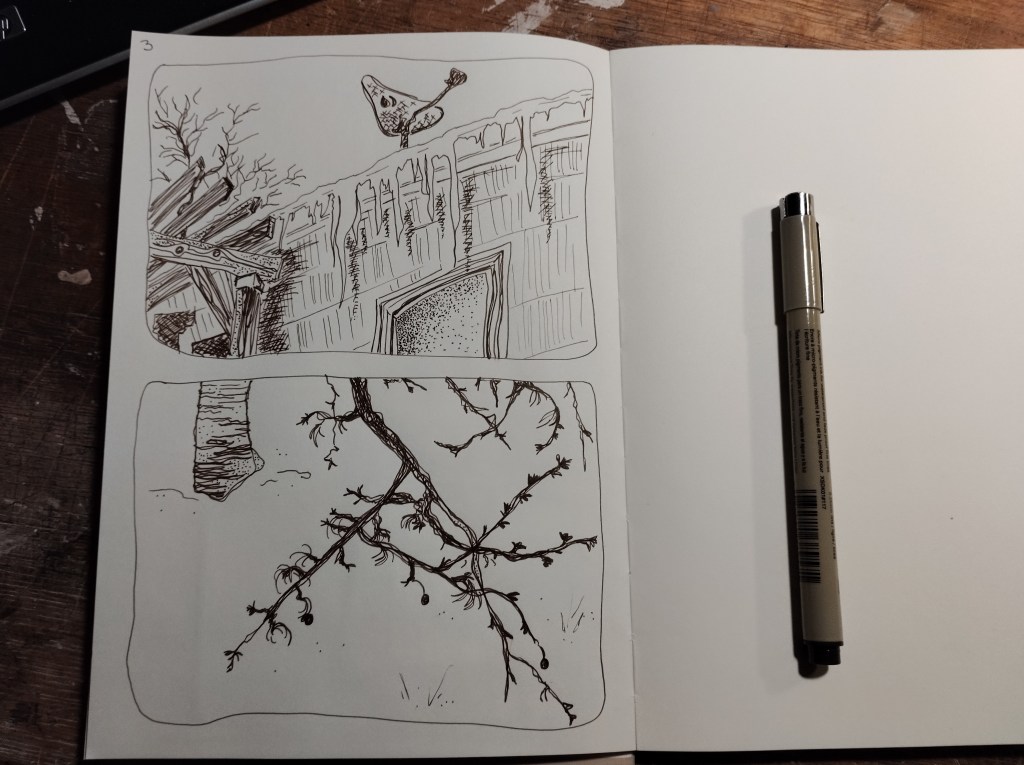 Follow along for ink drawings of photos taken on my Light III, some likely more intelligible than others. For example, the second panel from this week’s installment of adventures is a high angle of my cherry tree’s lower branches and trunk against the snow. No one has been able to see it. But I can see it, and anyway I’m still learning.