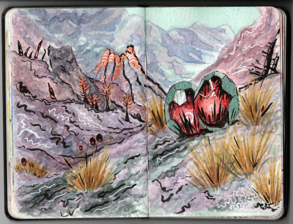 I was intimidated by the geometric, egg-shaped mineral formations on this planet, so naturally I made them the focus. I love how the volcano turned out, and the little brush pen trees, and even the mountains in the distance are fine.