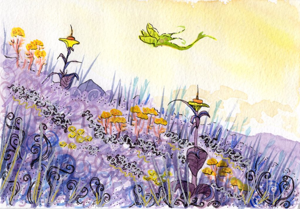 I wanted to return to this series of paintings I teased last month, from my No Man’s Sky travel journal. This, as you can probably tell from the title, is the first.