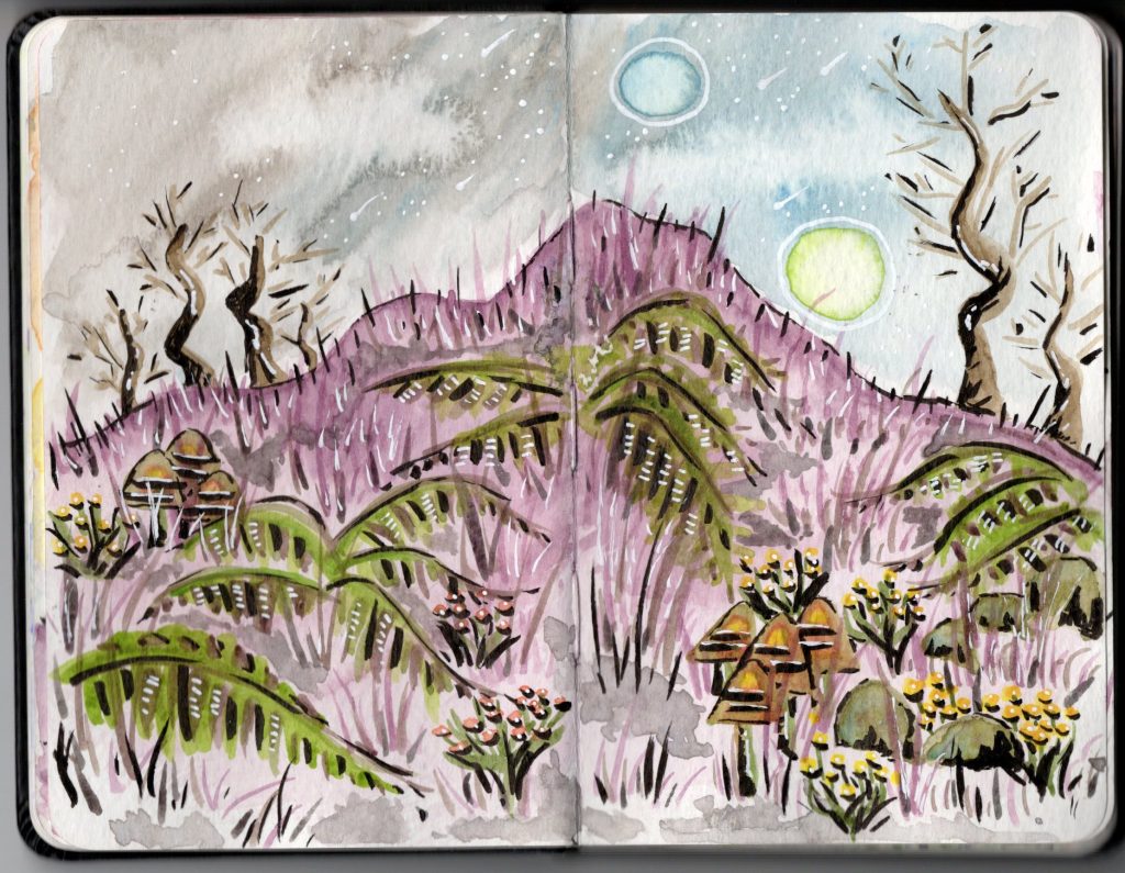Since I wrote yesterday about how much I’ve been practicing and trying to level up as an artist, I thought I’d share the first page of my No Man’s Sky travel journal today, from all the way back in 2022. This was about a month after I started painting. For comparison, I shared more recent entries in this Moleskine here and here.